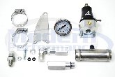 Run the supplied braided stainless steel hose back to the filler line at the tank. All necessary fittings, hose, fuel pressure gauge, regulator bracket, nuts, bolts, and hose clamps are included to make this a complete fuel return kit. We also include a billet aluminum sleeve to block off the factory regulator in the stock fuel filter.