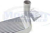 This intercooler utilizes a (25.5 inch wide, 6 inch tall, 3.5 inch thick) large bar-and-plate core, which reduces intake temperatures by more than 15% while delivering 40% less pressure drop than the factory cooler. This extremely efficient intercooler is designed to function with all factory equipment, including the factory bumper crash bar, making this the perfect bolt-on upgrade for improving the efficiency of your charge air system. This design significantly reduces the effects of heat soak, which improves performance on the strip and the street. This intercooler requires no vehicle modification, yet it will support substantial boost pressure and horsepower.