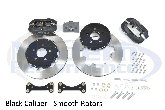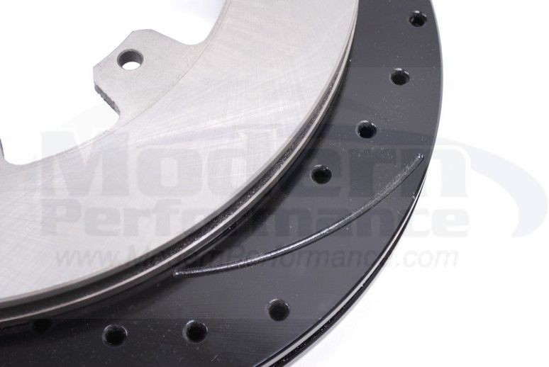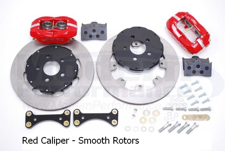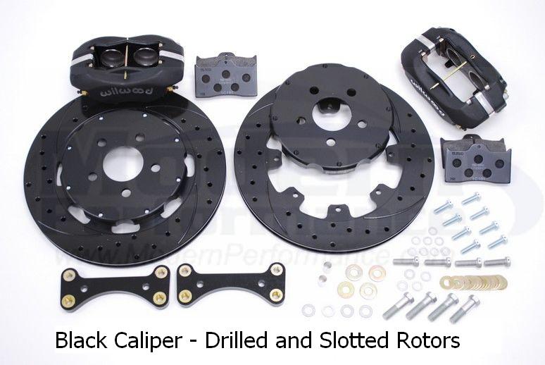 These big brake kits are offered with some options. First, you upgrade from the the smooth rotor and get a cross drilled and slotted rotor. These rotors will have a black coating all over when they are new. After some driving the surface that contacts the pad will turn silver but the recessed surfaces will stay black, this makes for a nice contrast! Then you may also choose to stay with the standard flat black caliper or upgrade to the glossy red! You must also purchase the Wilwood Stainless Brake Lines in order to install these kits.
